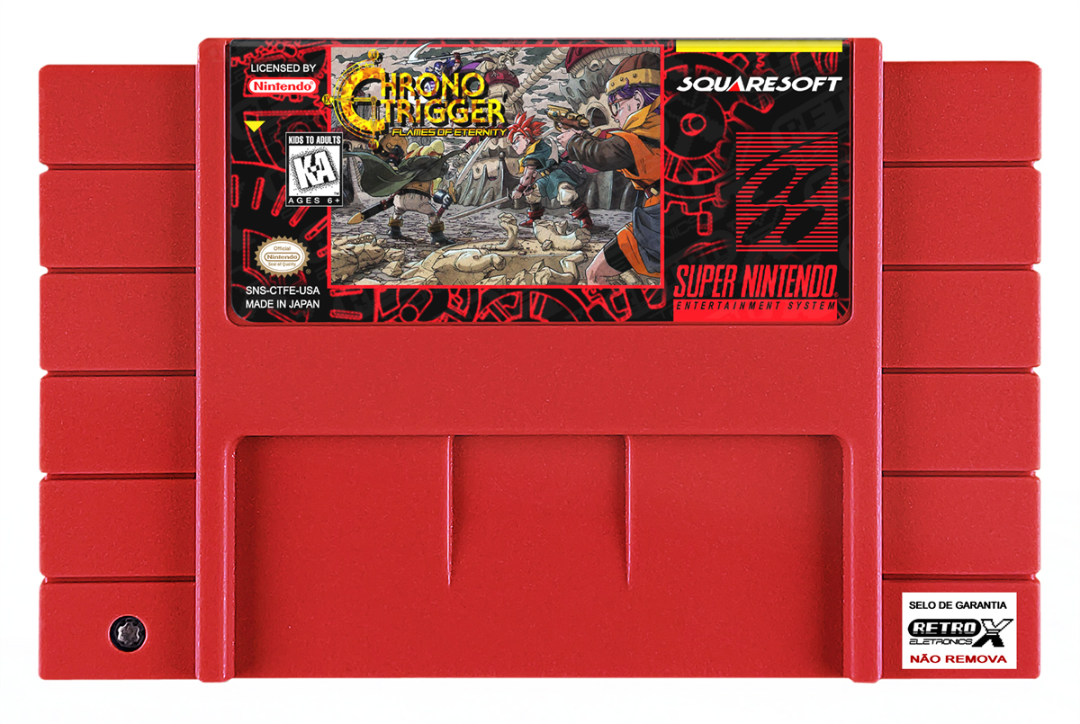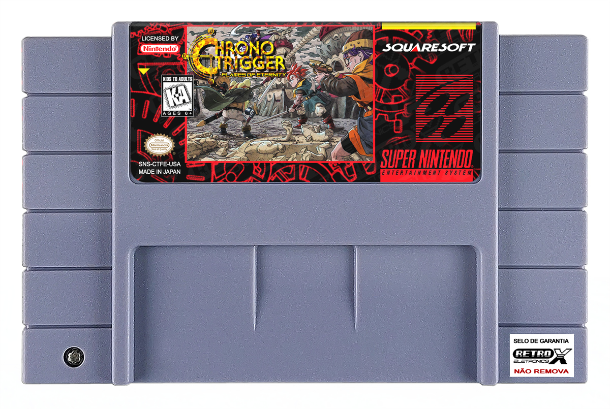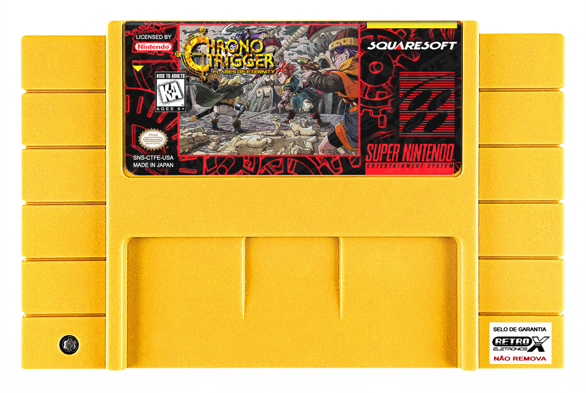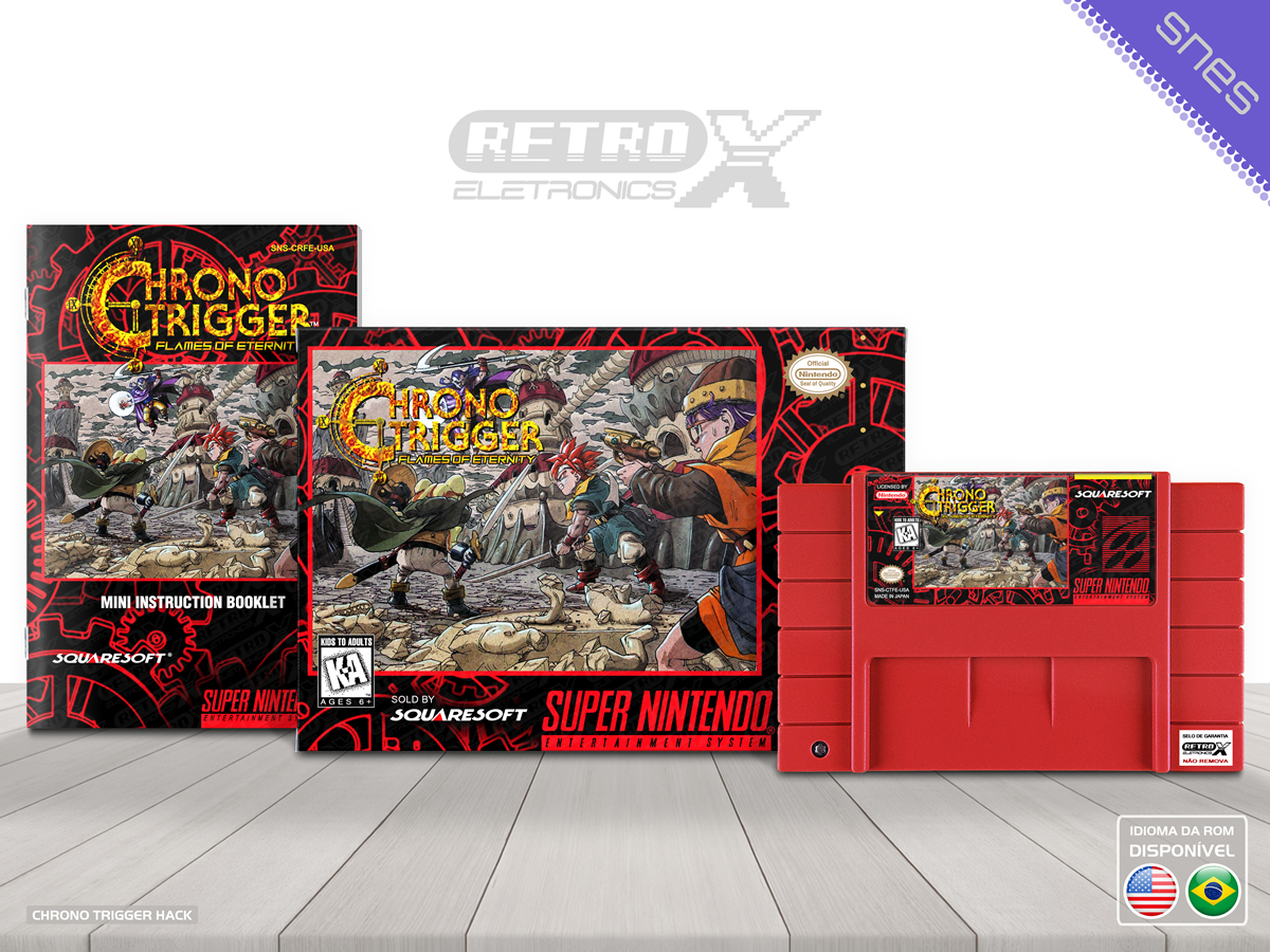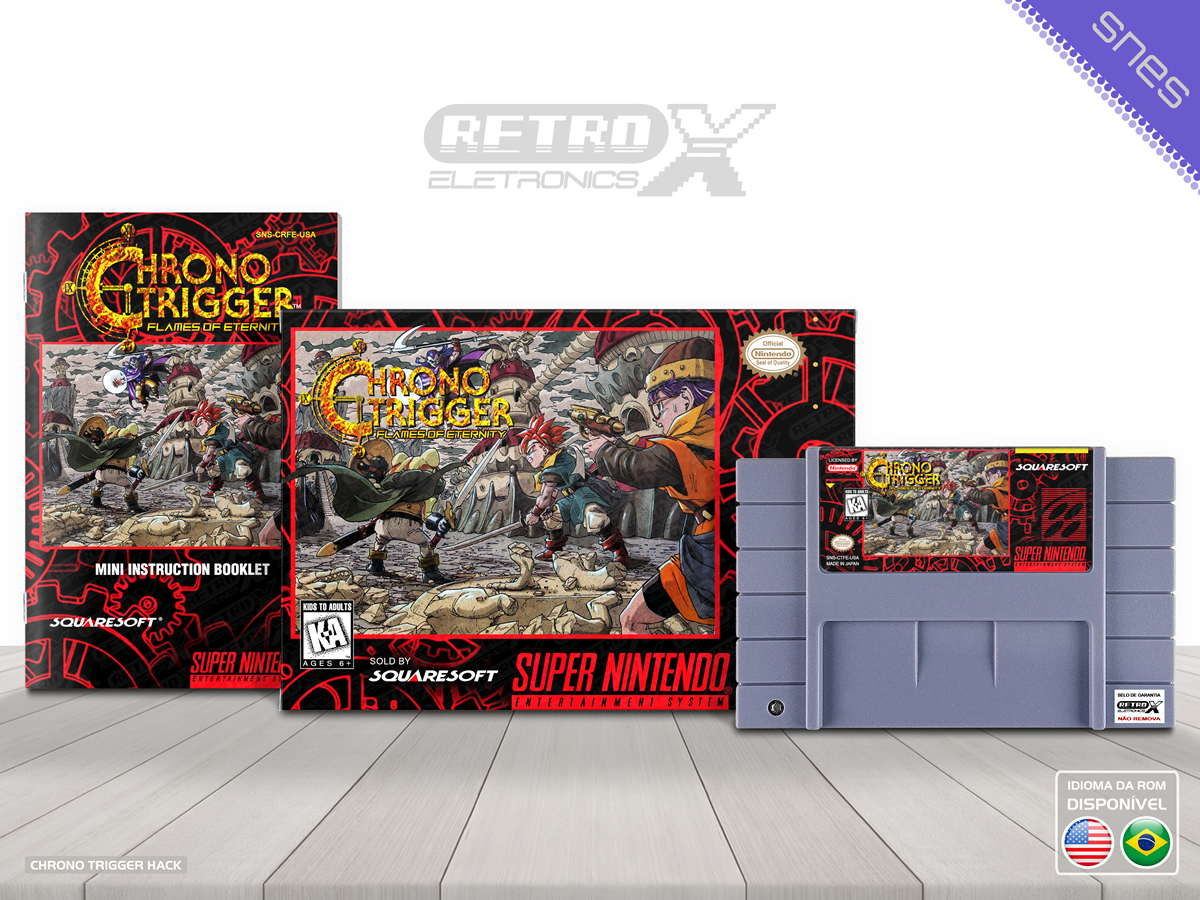 “Chrono Trigger – Flames of Eternity” é um *hack* de *Chrono Trigger* para Super Nintendo que funciona como uma sequência não oficial e totalmente nova ao clássico. Este projeto expande a história original, apresentando uma narrativa inédita que se passa após os eventos de *Chrono Trigger*, com novos cenários, inimigos, itens e quests, oferecendo mais de 30 horas de jogo e elementos de história que preenchem lacunas entre *Chrono Trigger* e *Chrono Cross*. É considerado um dos maiores projetos de hack de RPG baseados em *Chrono Trigger* e inclui conteúdo original e melhorias no enredo e exploração.