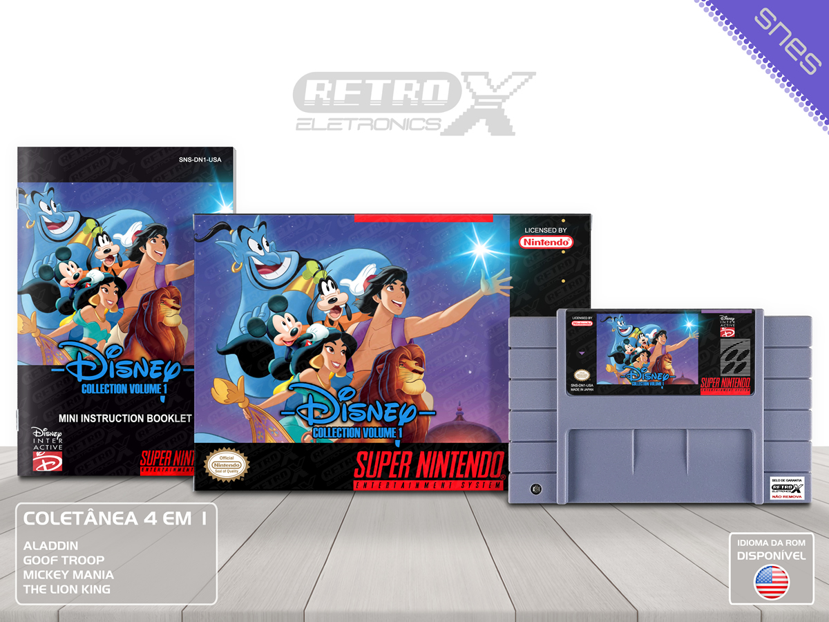 A Disney Collection Volume 1 é uma coletânea que reúne 4 dos mais famosos jogos da Disney para o Super Nintendo Entertainment System (SNES), com títulos clássicos que trazem aventuras e personagens inesquecíveis dos filmes mais amados.