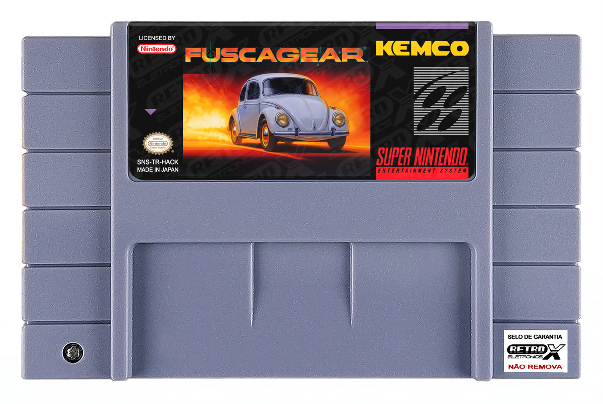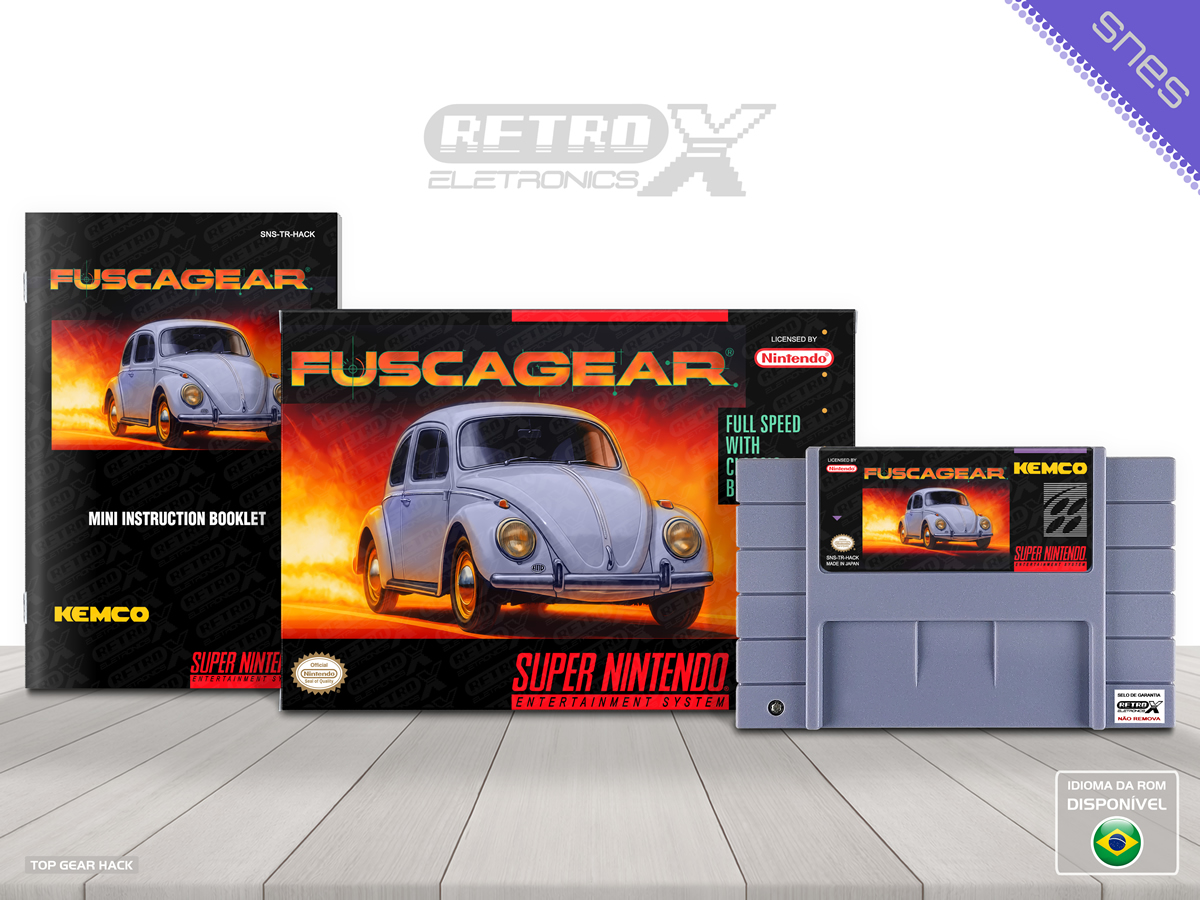 “Fusca Gear” é um *hack* de *Top Gear* para Super Nintendo criado pela Equipe Falcon Brasil e D83 Games, onde todos os carros do jogo original foram substituídos por Fuscas em várias cores (vermelho, amarelo, azul e preto), trazendo um visual temático e personalizado ao clássico jogo de corrida. O jogo está totalmente em português, com placas de diálogo no idioma e todas as pistas liberadas desde o início, oferecendo uma experiência divertida e acessível de corrida no estilo clássico do SNES. Gênero: Corrida