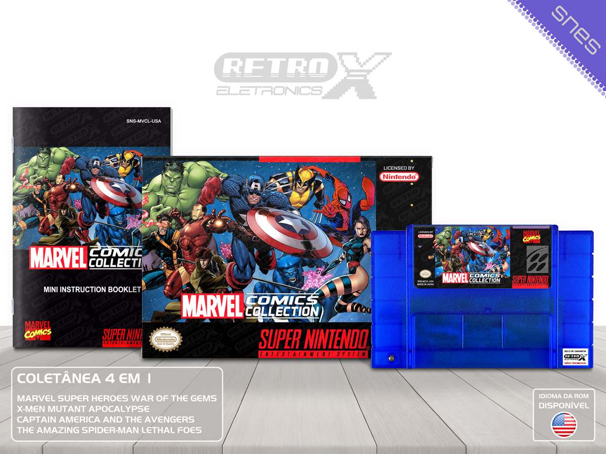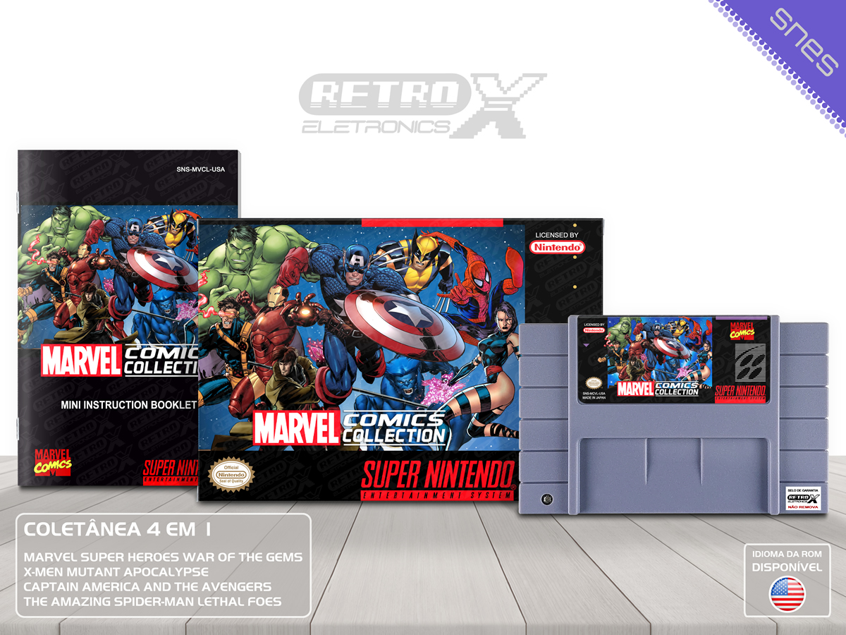 A Marvel Comics Collection é uma coletânea que traz 4 jogos incríveis da Marvel para o Super Nintendo Entertainment System (SNES), reunindo os heróis mais poderosos do universo Marvel em aventuras épicas de ação e combate. Desfrute de lutas emocionantes com personagens como Homem-Aranha, Capitão América, X-Men e muito mais.