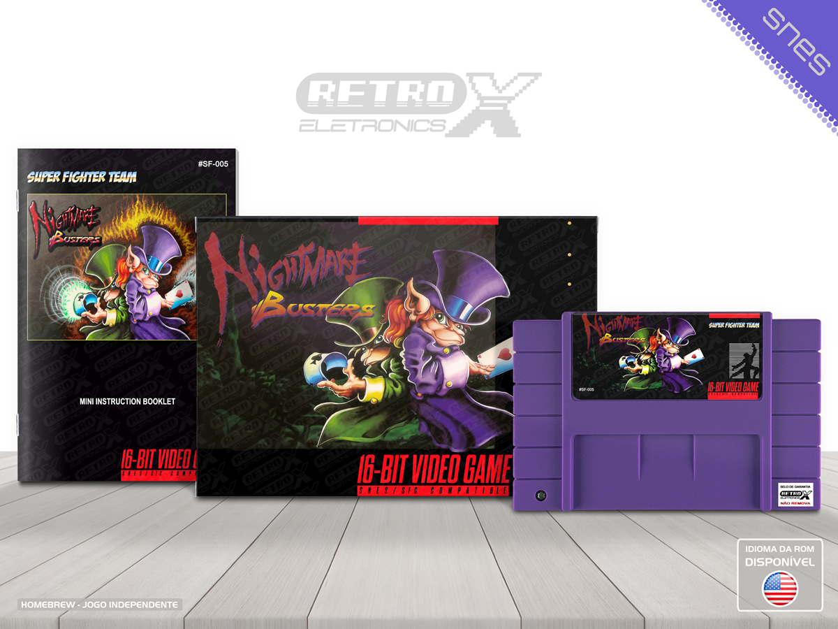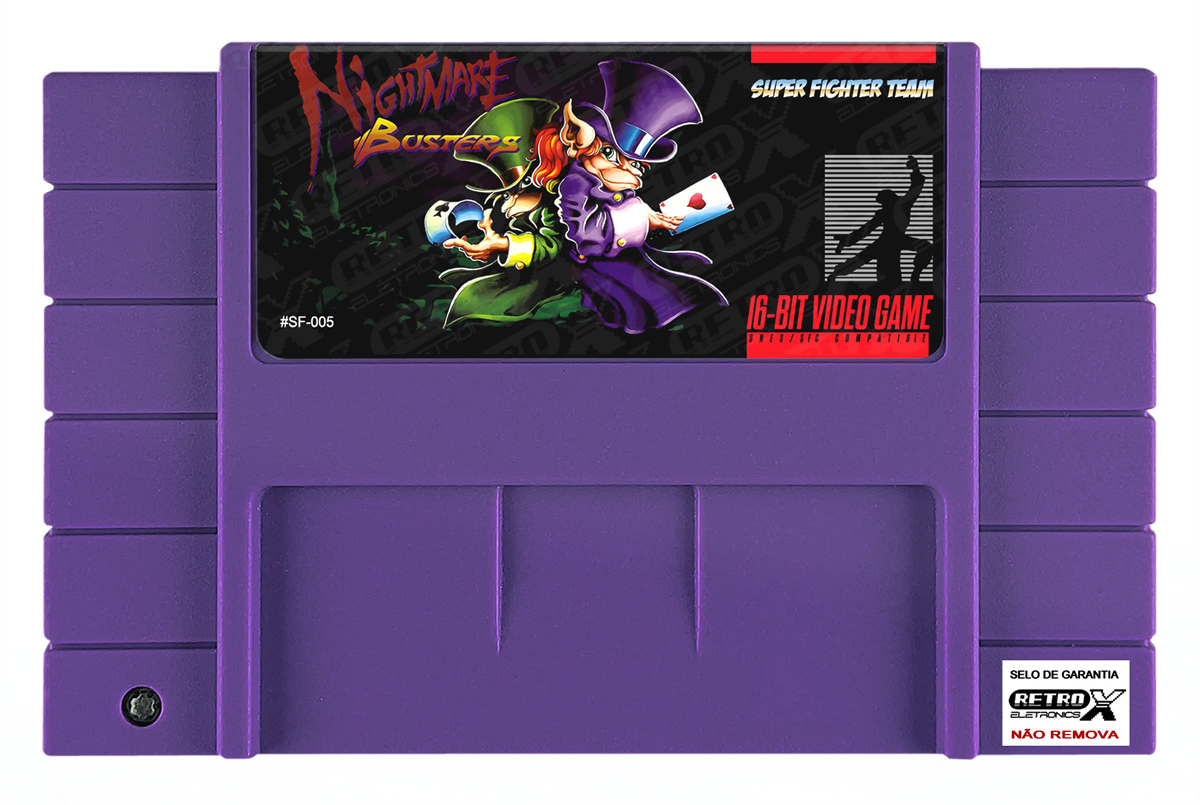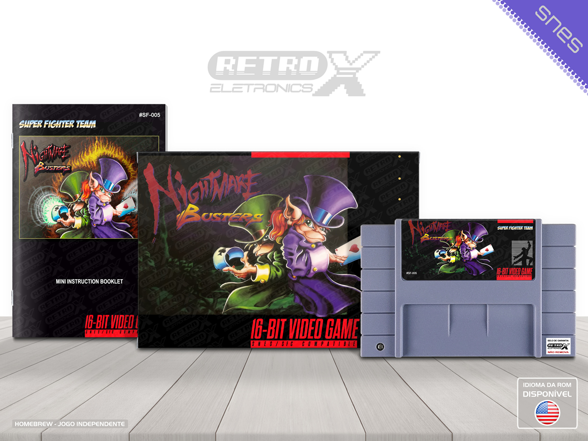 Nightmare Busters é um jogo de ação, run ‘n gun lançado para o Super Nintendo Entertainment System (SNES) em 2013, mas originalmente planejado pela Arcade Zone em 1994/1995. Após ser cancelado na década de 90, o jogo foi finalizado e lançado como um cartucho físico por fãs e produtores independentes. Com uma história única, o jogo coloca o jogador no controle de dois duendes, Flin e Floyd, que lutam contra monstros para salvar os sonhos das crianças. *Nightmare Busters* é um exemplo de título *homebrew* (feito por fãs) que ganhou status cult entre os colecionadores e entusiastas do SNES.