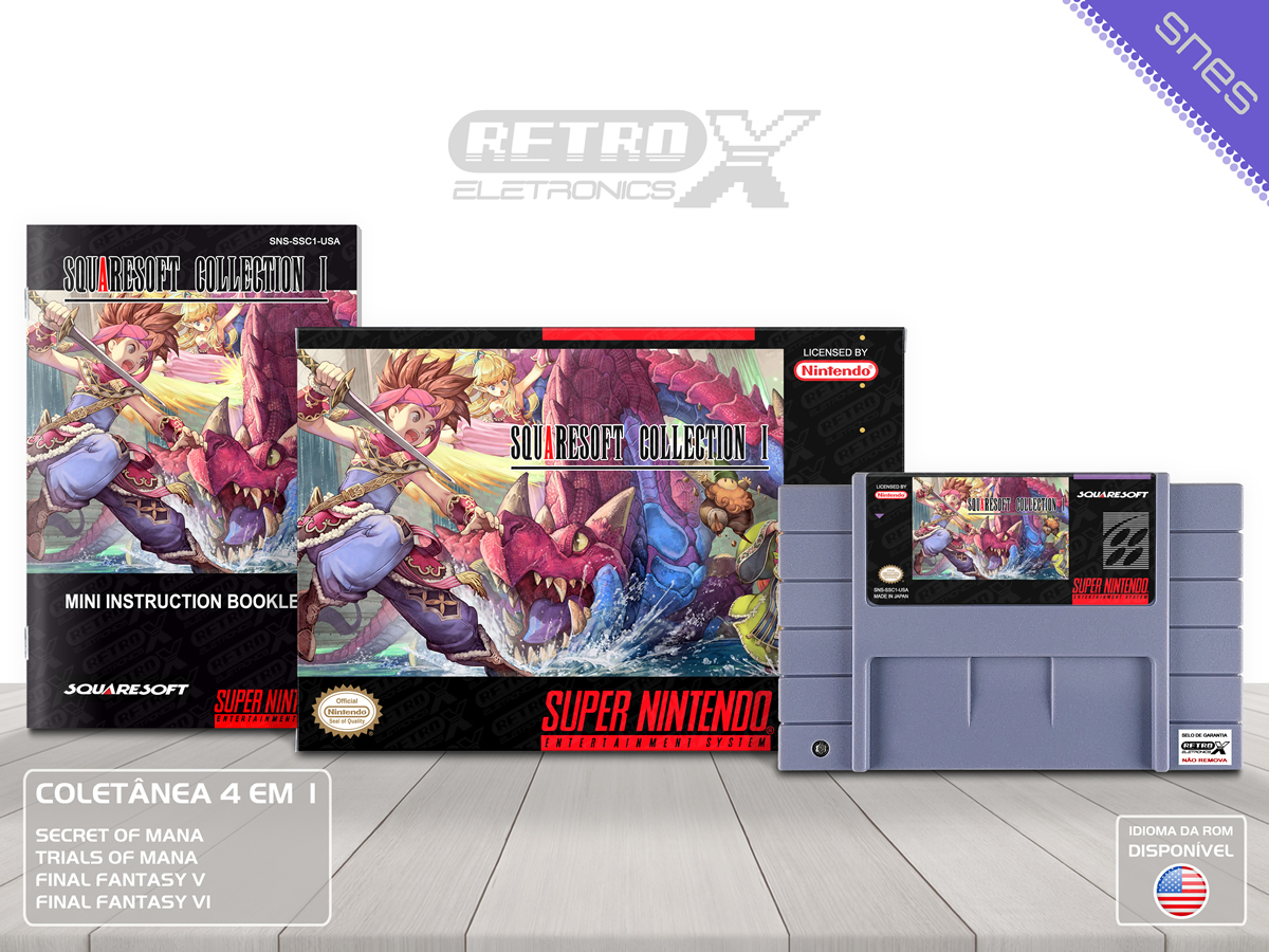 A Squaresoft Collection 1 é uma coletânea que reúne 4 dos maiores clássicos RPGs da *Squaresoft* para o Super Nintendo Entertainment System (SNES). Com histórias épicas, personagens memoráveis e batalhas estratégicas, essa coleção é essencial para os fãs de RPG, reunindo alguns dos títulos mais aclamados da história do videogame.