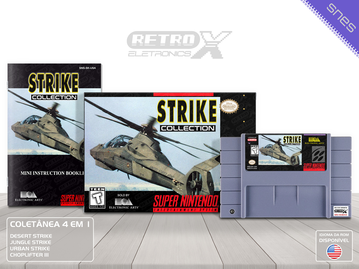 A Strike Collection é uma coletânea que reúne 4 grandes jogos de ação e combate aéreo para o Super Nintendo Entertainment System (SNES), onde o jogador assume o controle de helicópteros em diferentes cenários de guerra, enfrentando inimigos e realizando missões intensas. Cada jogo oferece uma experiência única com gráficos desafiadores e jogabilidade dinâmica.
