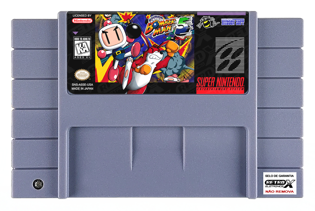 Super Bomberman 5 é um jogo de ação e estratégia lançado para o Super Nintendo Entertainment System (SNES) em 1997, desenvolvido pela Hudson Soft. Este título final da série *Super Bomberman* no SNES traz melhorias em relação aos jogos anteriores, com novos modos de jogo, personagens e fases. No enredo, Bomberman deve enfrentar um vilão maligno e salvar o universo da destruição. O jogo mistura a clássica jogabilidade de colocar bombas com novas mecânicas de combate.