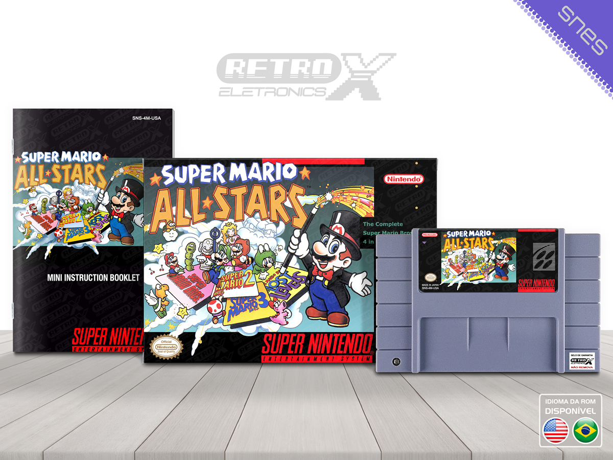 Super Mario All-Stars é uma coletânea de jogos lançada para o Super Nintendo Entertainment System (SNES) em 1993 pela Nintendo. O jogo traz versões aprimoradas de quatro clássicos da série *Super Mario*: *Super Mario Bros.*, *Super Mario Bros. 2*, *Super Mario Bros. 3* e *Super Mario Lost Levels*, todos com gráficos melhorados e músicas remasterizadas, proporcionando uma nova experiência sem perder a essência dos originais.