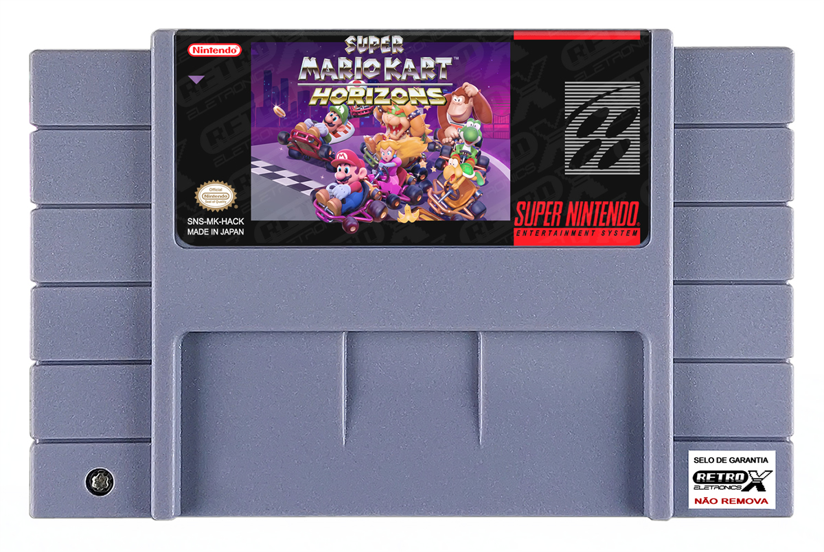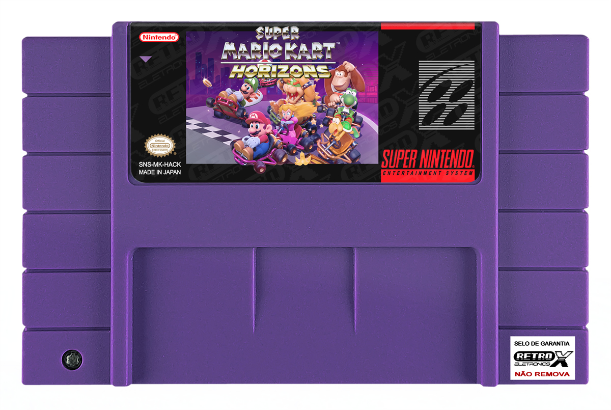 “Super Mario Kart: Horizons” é um *hack* de _Super Mario Kart_ para Super Nintendo criado pela comunidade ROM hacking que recria a experiência clássica de corrida com conteúdo totalmente novo. O hack traz **20 pistas de corrida inéditas** em **8 temas personalizados**, incluindo planícies, minas abandonadas, ruínas da selva e picos montanhosos, cada uma com seu visual único e atmosfera diferenciada. Além das pistas de corrida, também foram adicionadas **4 arenas de batalha**, uma trilha sonora original, menus atualizados, sprites reformulados e modos extras como espelho, prova de tempo e modos de dificuldade adicionais. O design foca tanto na estética quanto na jogabilidade, oferecendo desafios variados e uma sensação fresca inspirada no universo de corridas do Mario. Gênero: Corrida