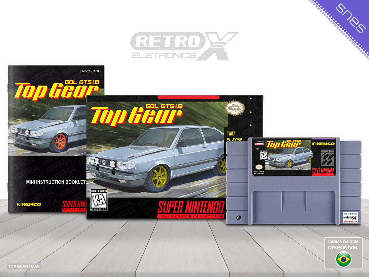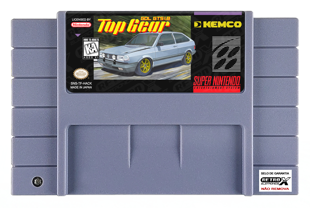 “Top Gear GOL GTS 1.8” é um *hack* de _Top Gear_ para Super Nintendo desenvolvido pela **Equipe Falcon Brasil e D83 Games** que transforma o clássico jogo de corrida adicionando o **carro Volkswagen GOL GTS 1.8** como veículo principal em quatro cores diferentes (azul, preto, vermelho e amarelo). Nesta versão, todas as pistas estão liberadas desde o início — dispensando o uso de senhas — e os textos do jogo estão totalmente em português, incluindo os painéis mostrados durante as corridas. Obstáculos em algumas pistas foram substituídos por cones, e o visual e sons foram adaptados para criar uma experiência temática mais brasileira no estilo do jogo original. Gênero: Corrida